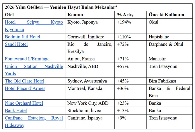 2026’da gezginler, tarihi mimariyi modern konforla buluşturan otellerde konaklayarak “restorasyon” kelimesine gerçek anlamını kazandırıyor. Hotels.com’un “2026 Yılın Otelleri” listesi, eski okullar, tren istasyonları ve bankalar gibi tarihi yapılarda hizmet veren otellerin popülaritesinde gözle görülür bir artış olduğunu gösteriyor. Bu tür oteller, misafirlerine hem konfor hem de güçlü bir kültürel kimlik sunuyor.