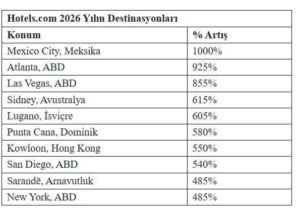 Aynı raporda Hotels.com, milyonlarca günlük kullanıcı verisine dayanan “Yılın Destinasyonları” listesini de paylaştı. Liste, Türk gezginlerin ilgisinin hızla arttığı destinasyonları öne çıkarıyor.