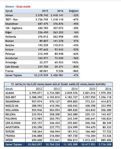 Uyruk bazında Ukrayna, İsrail ve Litvanya hariç tüm pazarlarda kayıp yaşandı. En fazla düşüş yaşanan ülke yüzde 67'lik kayıpla Rusya oldu. 2015'de gelen Rus turist sayısı 3 milyon 726 bin 745 olurken, 2016'da bu sayı 1 milyon 218 bin 110'da kaldı.