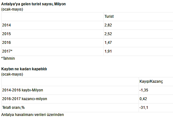 Turizmdatabank'ın derlediği verilere göre; Rus turist sayısındaki artış ile toparlanan Antalya, 2017’nin 5 aylık döneminde, krizdeki kaybının yüzde 30’unu telafi etti. 2015 yılı ortalarından beri turist sayısında önemli kayıplar yaşayan Antalya turizmi, 2017’de Rusya pazarının yeniden devreye girmesi ile kriz dönemindeki kayıplarının önemli bir kısmını telafi etti.