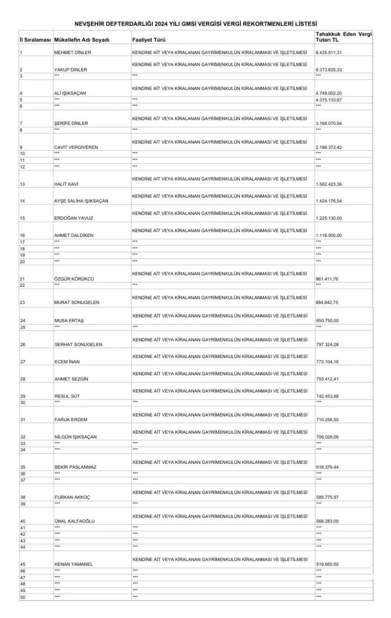 Nevşehir Defterdarlığı, 2024 vergilendirme dönemine ilişkin Gayrimenkul Sermaye İradı (GMSİ) Gelir Vergisi rekortmenlerini açıkladı. Listeye göre, kirasını beyan ederek en fazla vergi ödeyen isimler belli oldu.