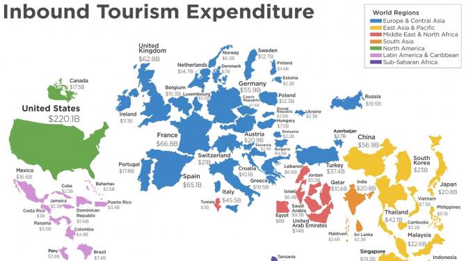 Dünya Bankası’nın 2014 yılı verileriyle hazırlanan görsellerden ilki ülkelerin turizm geliri düzeylerini gösteriyor. Buradaki herhangi bir ülkeye seyahat eden yabancı ülke vatandaşlarının ulaşım, konaklama, günlük harcama masrafları gelir kaleminde kabul ediliyor. Tabloya göre dünyada en yüksek turizm geliri elde eden ülke 220 milyar dolarla ABD. 66.8 milyar dolarla İngiltere, 62.8 milyar dolarla Fransa, 56.9 milyar dolarla Çin ve 55.9 milyar dolarlık gelirle Almanya da turizm gelirleri konusunda şanslı ülkeler. Türkiye ise 37.4 milyar dolarlık geliriyle Tayland, İtalya’nın gerisinde, Avustralya’nın biraz önünde yer alıyor, ilk 5’e giremese de ilk 10’da.