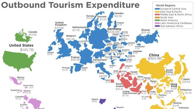Peki kimler yurt dışında en çok para harcıyor? İlginçtir, bu sıralamada ilk değişmiyor ancak ilk 5’teki sıralama değişiyor. Çinli turistler yurt dışında 164.9 milyar dolar, ABD’liler 145.7 milyar dolar, Almanlar 106.6 milyar dolar, İngilizler 79.9 milyar dolar ve Fransızlar 59.4 milyar dolar harcıyor. Grafikler gösteriyor ki ekonomik seviyesi yüksek ülkeler hem turizm gelirleri açısından daha şanslı hem de yurt dışına daha çok çıkıyor ve daha çok para harcıyor. Türkiye ise, bu genellemelerin aksine turizm gelirlerinin çok altında, sadece 5.5 milyar dolarlık yurt dışı turizm harcaması yapmış gözüküyor.