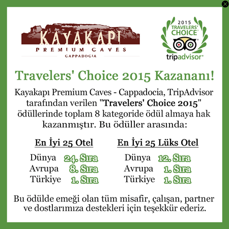 Kayakapı Premium Caves – Cappadocia, 2015 yılına TripAdvisor’dan aldığı 8 ödülle hızlı bir giriş yapmıştı.