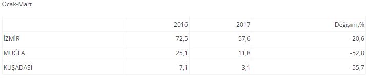 Yılın 3 aylık döneminde ülkemizin en büyük kruvaziyer turisti çeken limanı Kuşadası’na gelen yabancı ziyaretçi sayısı ise yüzde 55 gerileme ile 7 binden 3 bin sınırına doğru indi.
