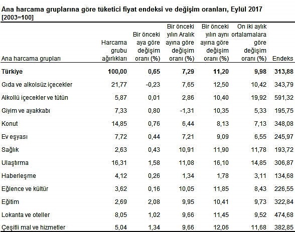 Türkiye İstatistik Kurumu’nun (TÜİK) açıkladığı verilere göre; TÜFE’de 2017 yılı Eylül ayında bir önceki aya göre % 0.65, bir önceki yılın aynı ayına göre % 11.20 artış gerçekleşti.