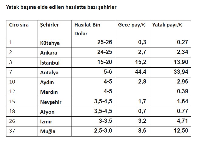 Turizm Databank’ın araştırmasına göre, Türkiye’de yatakların yaklaşık % 34’üne sahip ilk sıradaki Antalya, yatak başına elde edilen hasılatta ancak 7’inci olurken, yatakların yaklaşık % 14’üne sahip İstanbul 3’üncü sırada ve yatakların % 12,5’ine sahip Muğla ise 37’inci sıada. Yatakların yaklaşık % 5’ine sahip İzmir de 26’ıncı sırada. Yatakların yaklaşık % 3’üne sahip Aydın 10’uncu sırada. Öte yandan, yatakların yaklaşık 0,3 ve % 2,4’üne sahip Kütahya ve Ankara ilk 2 sırada.