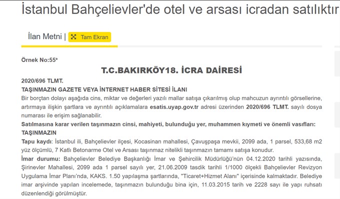 Haberhurriyeti'nden Özlem Ermiş Beyhan'ın haberine göre Bakırköy 18. İcra Dairesi tarafından verilen ilana göre 7 katlı betonarme otel ve arsası taşınmaz nitelikli taşınmazın tamamı satışa çıkarıldı.