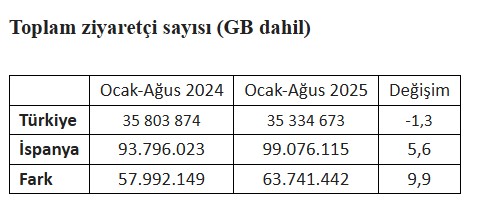 Turizm Databank'ın İspanya ve KTB İstatistiklerinden derlediği bilgilere göre, İspanya Ocak-Ağustos döneminde, toplam ziyaretçi sayısında Türkiye ile farkını 5,7 milyon daha artırdı. 8 ayda İspanya % 5,6 artışla 99 milyona ulaşıken, Türkiye düşüşle 35,3 milyon dolayına geldi. İki ülke farkı da % 10 artarak 57,9 milyondan 63,7 milyona çıktı.