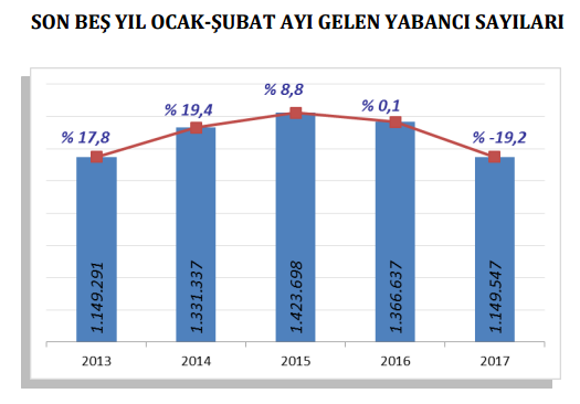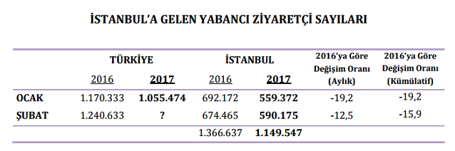 "Atatürk ve Sabiha Gökçen Havalimanları ile Haydarpaşa, Pendik, Tuzla, Zeytinburnu, Ambarlı ve Karaköy limanlarından alınan verilere göre 2017 yılı ocak-şubat aylarında İstanbul’a gelen yabancı sayısını geçen yıl ile karşılaştırdığımızda, yüzde 16 azalma olduğunu görmekteyiz. Geçen yılın ocak-şubat aylarına göre havayolu ile geliş yüzde 15,9 azalmış, denizyolu ile geliş yüzde 2,9 azalmıştır.
