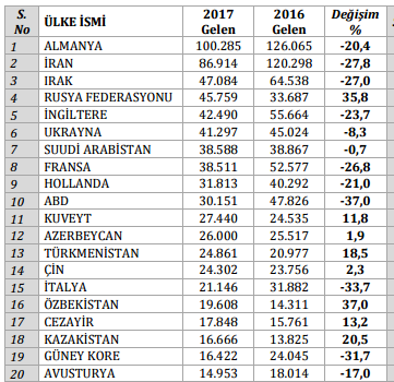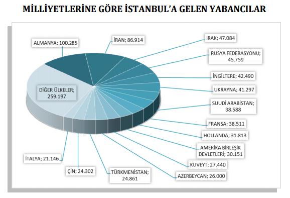 Almanlar: yüzde 8.7, İranlılar: yüzde 7.6, Iraklılar: yüzde 4.1, Ruslar: yüzde 4.0, İngilizler: yüzde 3.7, Ukraynalılar: yüzde 3.6, Suudi Arabistanlılar: yüzde 3.4, Fransızlar: yüzde 3.4, Hollandalılar: yüzde 2.8, Amerikalılar: yüzde 2.6, Kuveytliler: yüzde 2.4, Azerbeycanlılar: yüzde 2.3, Türkmenler: yüzde 2.2, Çinliler: yüzde 2.1, İtalyanlar: yüzde 1.8, Diğer ülkeler: yüzde 45,5."