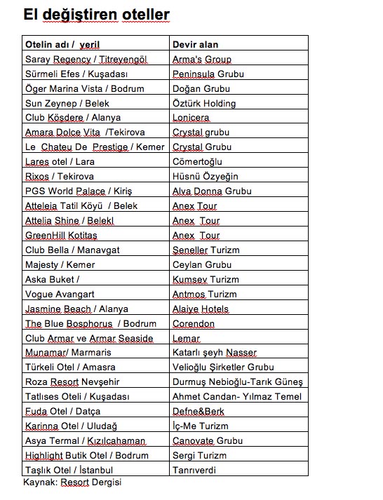 Akdeniz Turistik Otelciler ve İşletmeciler Birliği (AKTOB) ile Ekin Grubu'nun birlikte yayınladığı Resort Dergisi'nde yayınlanan araştırmaya göre bu yılın daha ilk beş aylık döneminde el değiştiren otel sayısı geçen yılın tamamının iki katını geçti.