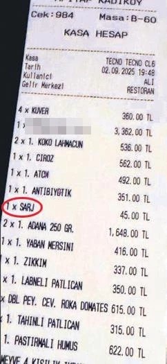 Yaklaşık 10 Bin Liralık hesabı ödeyen kişi, adisyonu incelerken 45 liralık “şarj ücreti” kalemini fark etti. Telefonunu şarj ettiği için bu ücreti ödemek zorunda kalan müşteri, olayı Cankurt’a anlatarak tepkisini dile getirdi.