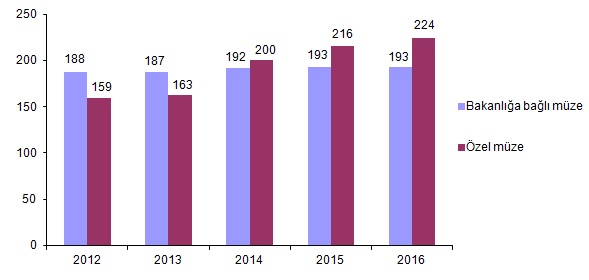 TÜİK'in açıkladığı verilere göre, Türkiye genelinde müze sayısı 2016 yılında yüzde 2 artarak 417 oldu. Bunların 193 tanesi Kültür ve Turizm Bakanlığı bünyesinde, 224 tanesi ise özel müze kategorisinde yer aldı.