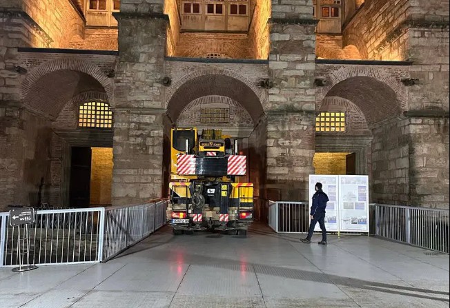 Ayasofya'nın restorasyonunda yüksek tonajlı vinçlerin kullanıldığı görüntüler sosyal medyada tepki çekti. Cumhuriyet’e konuşan arkeolog Ömer Faruk Yavaşçay, “UNESCO'nun ilkelerine göre dünya mirası statüsündeki Ayasofya’ya ağır tonajlı ekipmanın girmesi kesinlikle yasak. İşi ‘kolay’ hale getirmek için Ayasofya’ya vinç sokuyorlar.