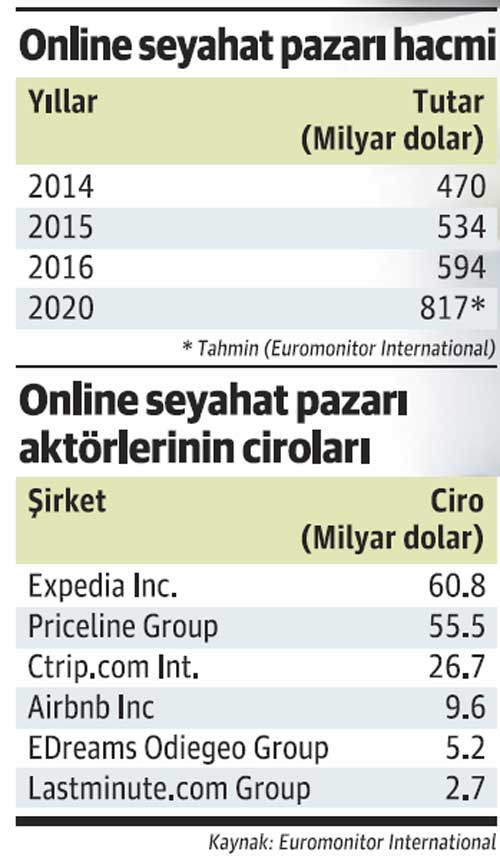 Sektörün en büyüğü 60.8 milyar dolarlık ciro ile Expedia Inc. ve ikinci sırada 55.5 milyar dolarlık ciro ile Priceline Group yer alıyor. İki şirketin toplam pazardaki payı 2011 yılında yüzde 38’den 2015 yılında yüzde 65’e çıktı. Google da reklamları sayesinde online seyahat pazarının ciddi kazananlarından. 2016’da Google, online seyahat pazarından 12.2 milyar dolar gelir sağladı. Bu tutar, aynı yıl Türkiye’nin turizmdeki gelirlerinin üçte biri kadar. Özellikle küçük oteller, tüketicinin karşısına eşit imkanlarla çıkma fırsatı buldukları için seyahat sitelerinde yer almak istiyor.