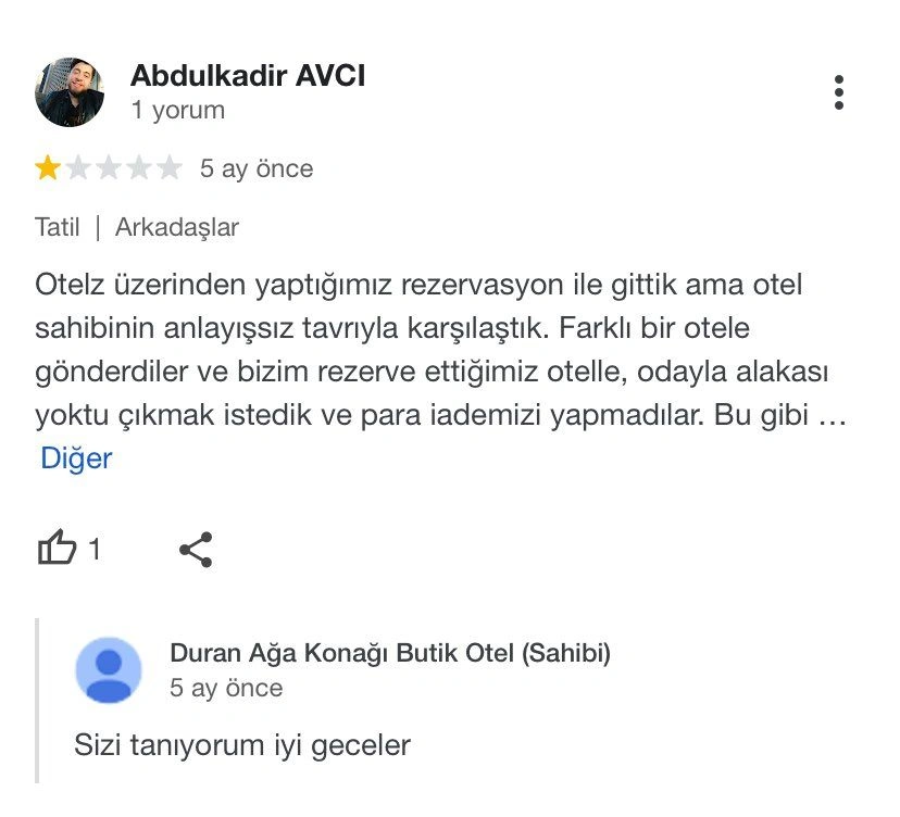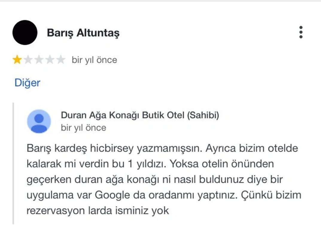 Bir sosyal medya kullanıcısının paylaşımı üzerine Gaziantep'te bulunan Duran Ağa Konağı Butik Oteli'nin sahibinin yorumları viral oldu. Medyatava'da yer alan habere göre, otelde konaklayıp beğenmeyen müşterilerin yorumlarına otel sahibinin verdiği cevaplar okuyanları güldürdü.