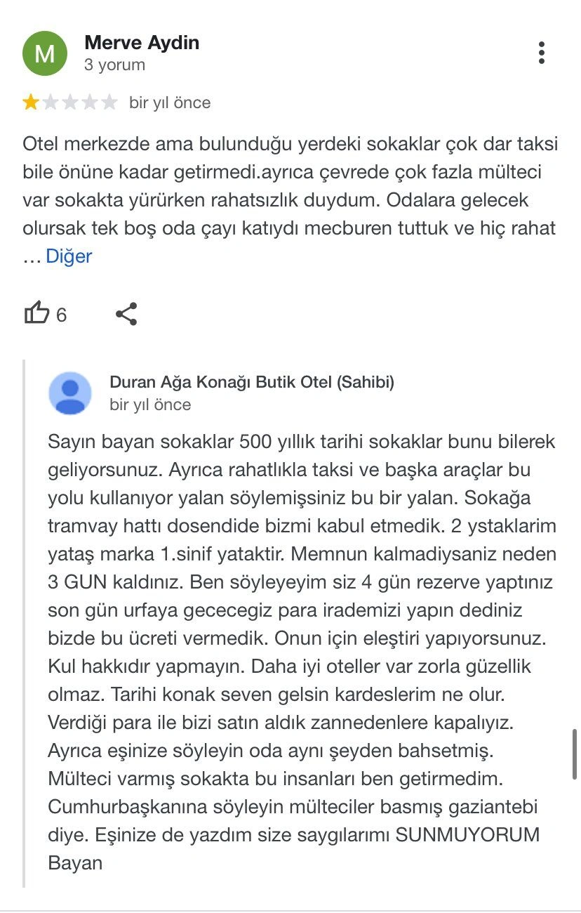 Bir sosyal medya kullanıcısının paylaşımı üzerine Gaziantep'te bulunan Duran Ağa Konağı Butik Oteli'nin sahibinin yorumları viral oldu.