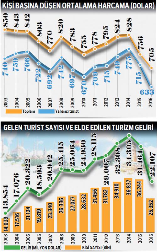 2000’li yılların başında Türkiye’ye gelen turist sayısının 15 milyon seviyelerinde olduğunu belirten Çakır, “2015’e gelindiğinde ise 36 milyon turiste ulaştık Ancak gelirimiz aynı şekilde artmadı. Turistlerin yaptığı kişi başına düşen ortalama harcama yaklaşık 15 yılda 850 dolardan 705 dolara kadar geriledi. 2017’nin ilk çeyreğinde ise kişi başına düşen ortalama harcama ise 633 dolar seviyesinde.