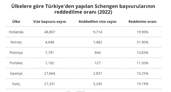Schengen vizesi uygulayan ülkeler arasında Estonya, Finlandiya ve Belçika, Türkiye'den 2022'de yapılan vize başvurularına yönelik ret oranlarında en ön sıralarda yer alan ülkelerden.