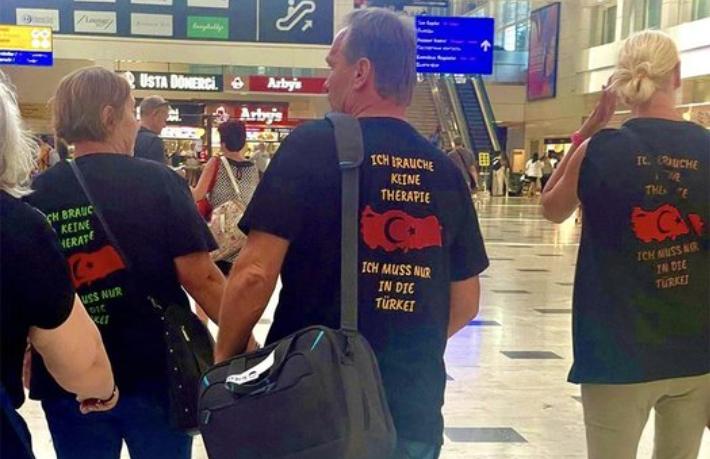 Antalya Havalimanı Dış Hatlar Gelen Yolcu bölümünde Almanya'dan gelen turist grubunun üzerindeki yazılar ise dikkatlerden kaçmadı. Sabah'ta yer alan habere göre, üzerinde Türkiye haritasının bulunduğu tişörtlerde "Terapiye ihtiyacım yok, Türkiye'ye gideyim yeter" yazılıydı.