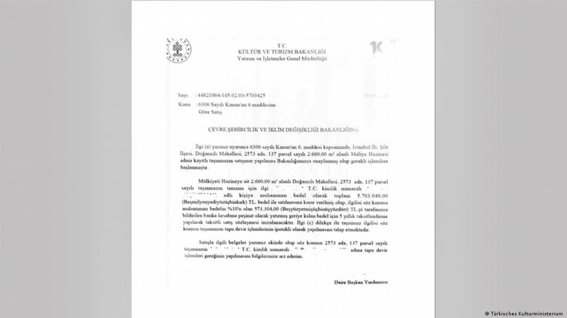 Sahte satış girişimi kapsamında, Kültür ve Turizm Bakanlığı Yatırım ve İşletmeler Genel Müdürlüğü antetiyle 19 Eylül 2024 tarihli bir yazı hazırlanarak Çevre, Şehircilik ve İklim Değişikliği Bakanlığı’na gönderildi. Yazıda, Maliye Hazinesi adına kayıtlı taşınmazın satışına Bakanlık tarafından onay verildiği ve işlemlerin başlatıldığı belirtildi.