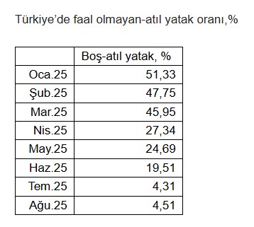 Türkiye’de 2025 yılının 8 ayında, toplam 1,82 milyon yatağın ortalama % 28’i yani 512 bin dolayında tesis yatağı atıl konumda. Sezonun kısa olmasından dolayı, ilk ve son aylarda düşük kalan turist sayısı, yatakların boş kalmasına neden oluyor.
