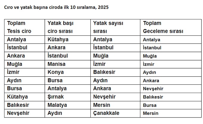 Turizm Databank'ın derlediği verilerine göre, Kütahya, Ankara, Manisa, Konya ve Bursa şehirleri, 2025 yılı 9 ayda, Türkiye ortalaması olan 8,3 Bin Dolar'ın üzerinde yatak başına düşen ciroya sahip.
