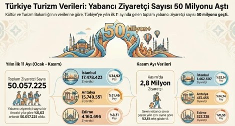 Kültür ve Turizm Bakanlığı verilerine göre kasım ayında Türkiye’ye gelen yabancı ziyaretçi sayısı 2 milyon 804 bin 911’e yükselirken, yılın ilk 11 ayında toplam ziyaretçi sayısı 50 milyonun üzerine çıktı.
