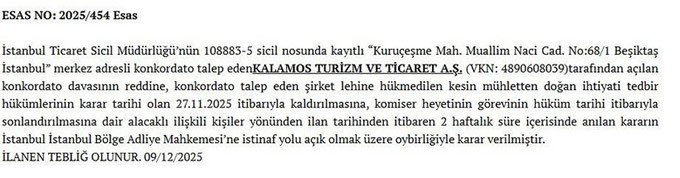 ''Konkordato talep eden Kalamos Turizm tarafından açılan konkordato davasının reddine, konkordato talep eden şirket lehine hükmedilen kesin mühletten doğan ihtiyati tedbir hükümlerinin karar tarihi olan 27.11.2025 itibarıyla kaldırılmasına, komiser heyetinin görevinin hüküm tarihi itibarıyla sonlandırılmasına dair alacaklı ilişkili kişiler yönünden ilan tarihinden itibaren 2 haftalık süre içerisinde anılan kararın İstanbul İstanbul Bölge Adliye Mahkemesi’ne istinaf yolu açık olmak üzere oybirliğiyle karar verilmiştir'' denildi.