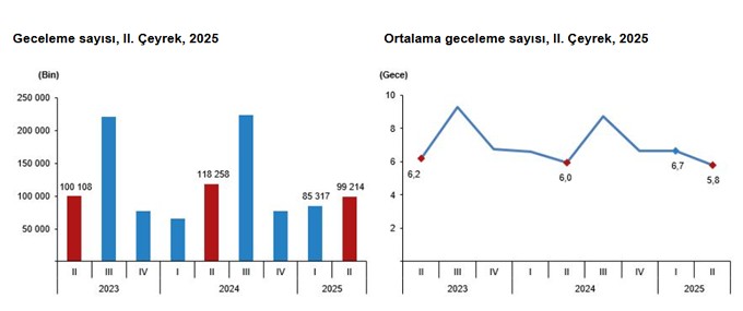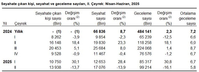 Nisan, Mayıs ve Haziran aylarından oluşan II. çeyrekte, yurt içinde ikamet eden 13 milyon 938 bin kişi seyahate çıktı. Bu çeyrekte seyahate çıkanlar 99 milyon 214 bin geceleme yaptı. Ortalama geceleme sayısı 5,8 gece oldu.
