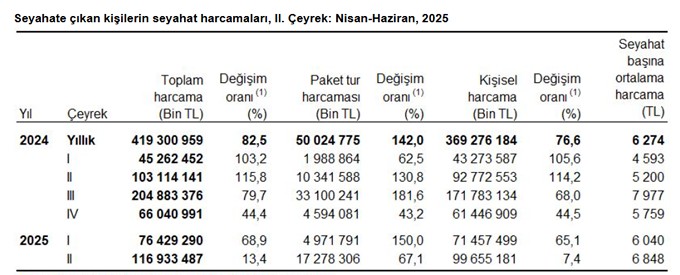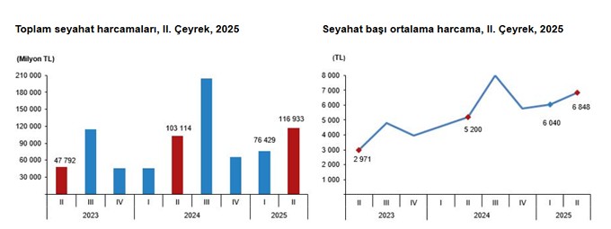 Yerli turistlerin, yurt içinde yaptıkları seyahat harcamaları 2025 yılının II. çeyreğinde bir önceki yılın aynı çeyreğine göre %13,4 artarak 116 milyar 933 milyon 487 bin TL olarak gerçekleşti. Bu harcamaların %85,2’sini 99 milyar 655 milyon 181 bin TL ile kişisel harcamalar, %14,8’ini ise 17 milyar 278 milyon 306 bin TL ile paket tur harcamaları oluşturdu. Seyahat başına yapılan ortalama harcama ise 6 bin 848 TL oldu.