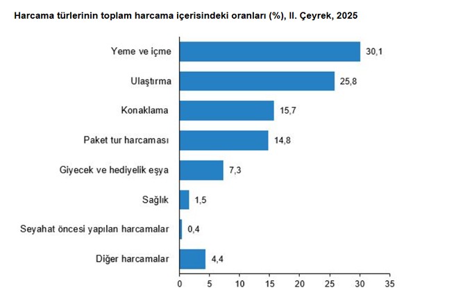 Bu çeyrekte harcama türlerinin toplam seyahat harcamaları içinde dağılım oranları incelendiğinde en fazla paya %30,1 ile yeme ve içme harcamaları, %25,8 ile ulaştırma harcamaları ve %15,7 ile konaklama harcamaları sahip oldu. Bu harcama türlerinin geçen yılın aynı dönemine göre değişim oranları incelendiğinde ise yeme ve içme harcamalarında %3,1, ulaştırma harcamalarında %7,1 ve konaklama harcamalarında ise %26,2’lik artış görüldü.